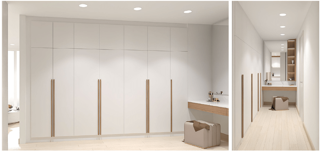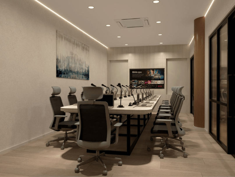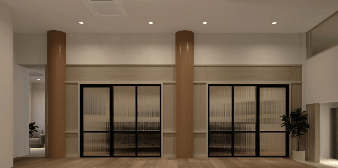 เน้นการต้อนรับด้วยเคาน์เตอร์ประชาสัมพันธ์ลายหินอ่อนสุดหรู ผสานการซ่อนไฟ LED เพิ่มมิติความทันสมัย พร้อมโซนรับแขกที่เป็นสัดส่วนและโถงทำงานที่โปร่งโล่ง