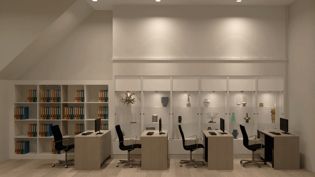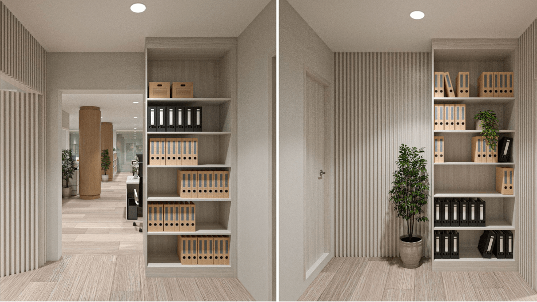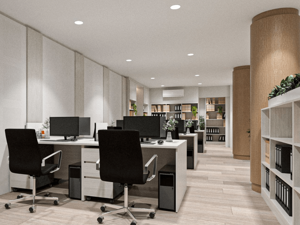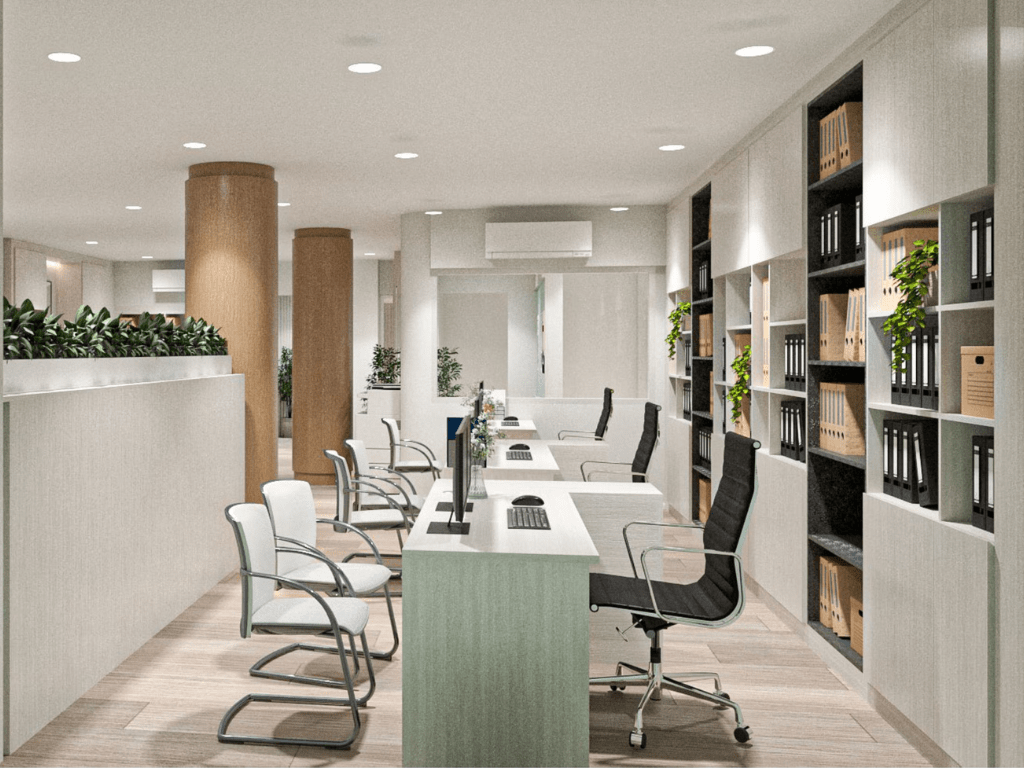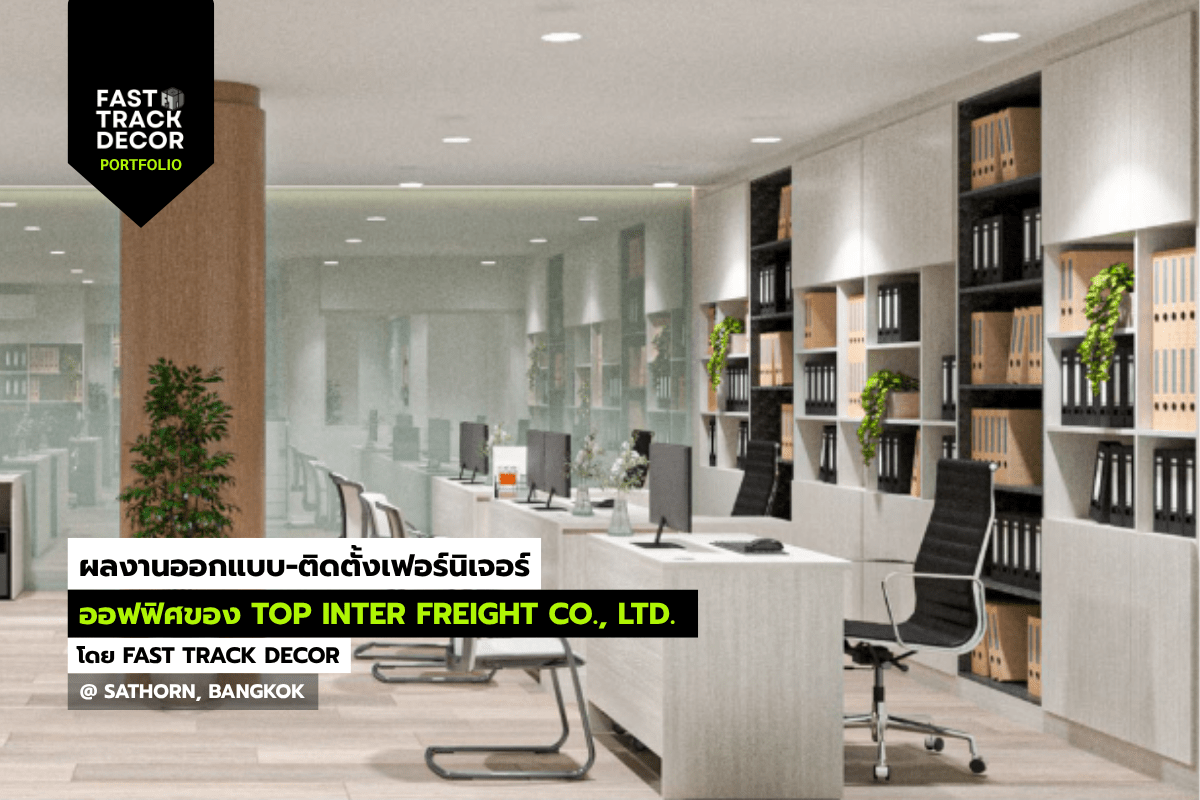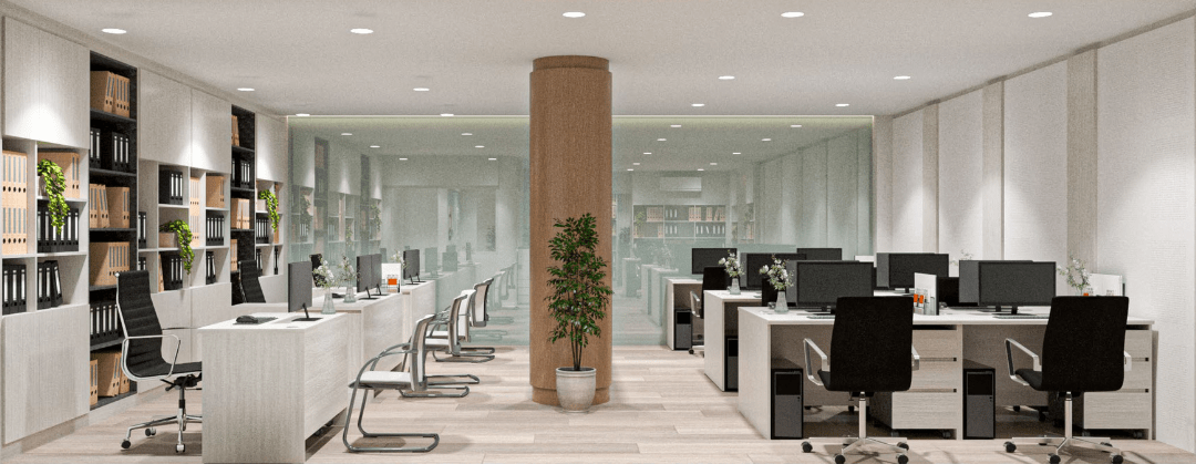 โซนทำงานหลัก (Office Zone) ที่เน้นความโปร่งด้วยกระจกใส จัดวางโต๊ะทำงานแบบเปิด (Open Plan) เพื่อการสื่อสารที่คล่องตัว พร้อมตู้เก็บเอกสาร Built-in สูงจรดฝ้าเพื่อความเป็นระเบียบสูงสุด